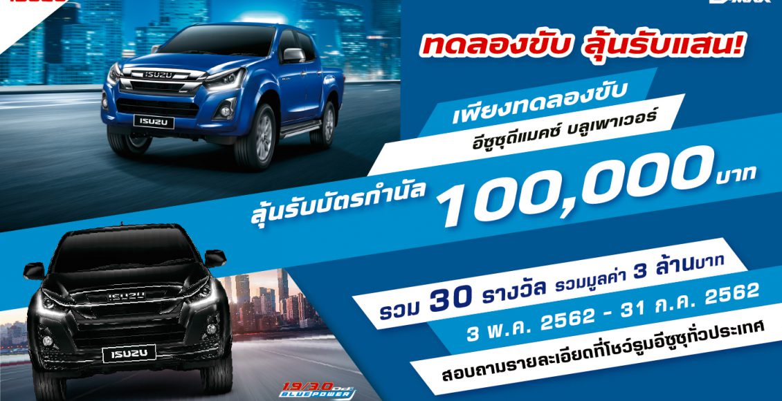 1. ทดสอบขับรถ อีซูซุดีแมคซ์ บลูเพาเวอร์ ที่โชว์รูมอีซูซุหรือสถานที่จัดกิจกรรมทั่วประเทศ ตั้งแต่ 3 พ.ค. 2562 – 31 ก.ค. 2562 เพื่อลุ้นรางวัล รางวัลรวม 30 รางวัล มูลค่ารวมทั้งสิ้น 3,000,000 บาท